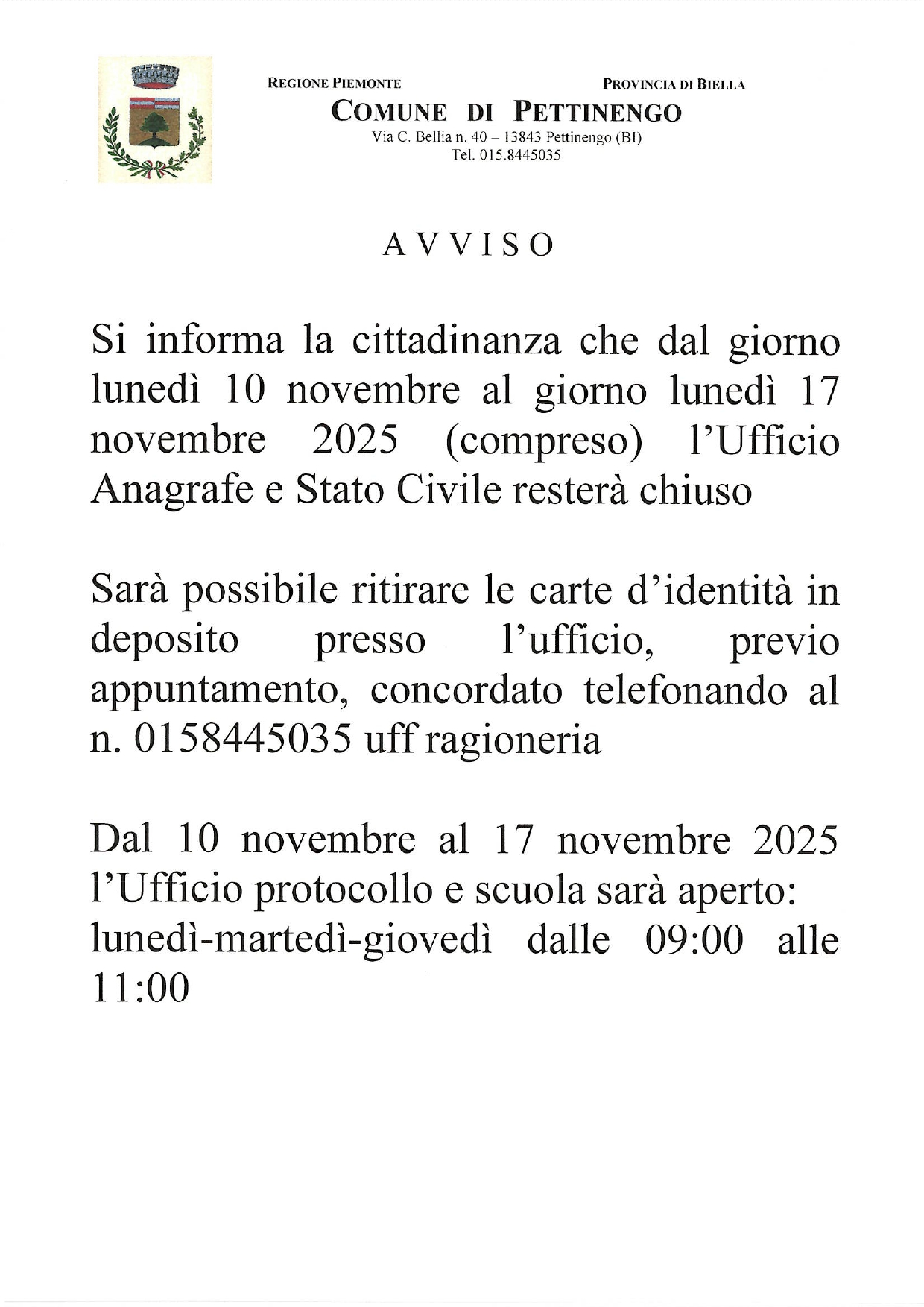 Chiusura temporanea ufficio Anagrafe e Stato Civile