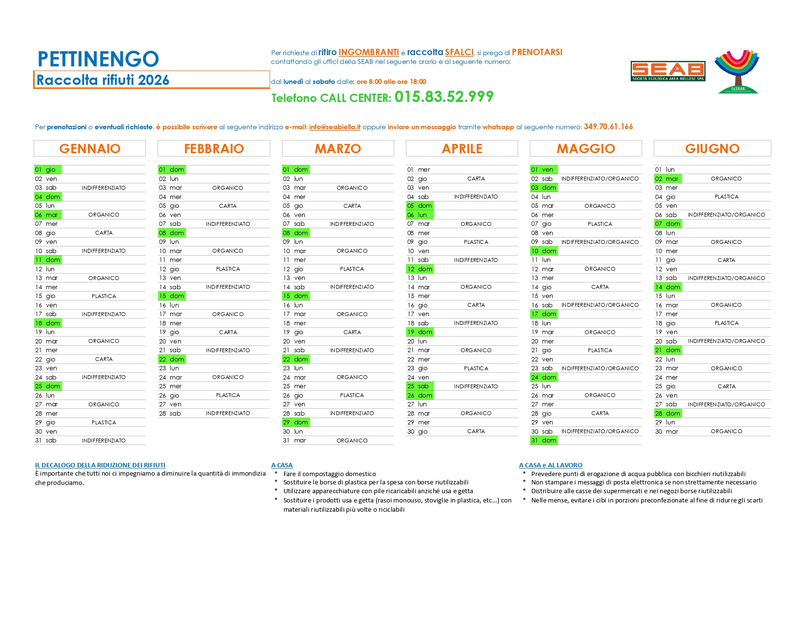 È disponibile il Calendario della raccolta dei rifiuti – anno 2026, con l’indicazione delle giornate di conferimento per ciascuna tipologia di rifiuto.